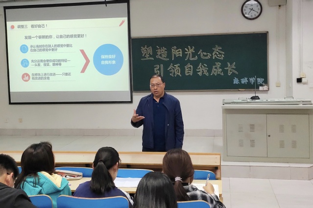 10月14日晚,黄色网址大全 于A302教室举办“塑造阳光心态,引领自我成长”心理讲座,心理学院李福洪副教授主讲,2021级全体新生到场聆听。