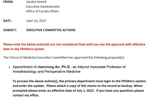安建雄教授曾于2001年-2004年在美国匹兹堡大学麻醉学系留学,回国后一直保持与匹兹堡大学的密切合作,并与其导师,麻醉学系前系主任John P. Williams教授联合发表SCI论文40余篇。在受聘客座副教授之前,安建雄一直是匹兹堡大学麻醉学系兼职助理教授。