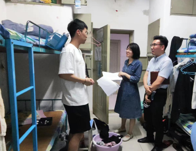 每到一处,辅导员都会向同学们叮嘱做好疫情反复准备、注意寝室用电安全、强化内务整理等事宜,对环境卫生较好、宿舍氛围活跃的宿舍进行表扬,对存在问题的寝室提出了整改建议和鼓励关切。“学生宿舍是学生学习和休息的主要场所之一,要像对待自己的家一样对待它,在用水、用电、网络等各方面都要注意…”言语间承载着辅导员对同学们的殷切希望。同时,辅导员与学生们就学业进展、未来规划、心理状态做了深入交流。