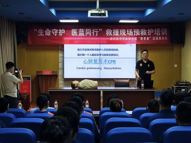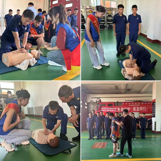 6月30日下午,潍坊医学院黄色网址大全 党总支组织师生党员和“醉青春”志愿服务队志愿者走进潍城区救援大队开展“庆七一”志愿服务活动,为消防员开展急救知识培训,提高消防员对灾害现场伤员及自我的应急救援能力和救援效率。