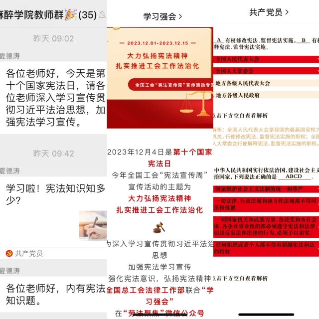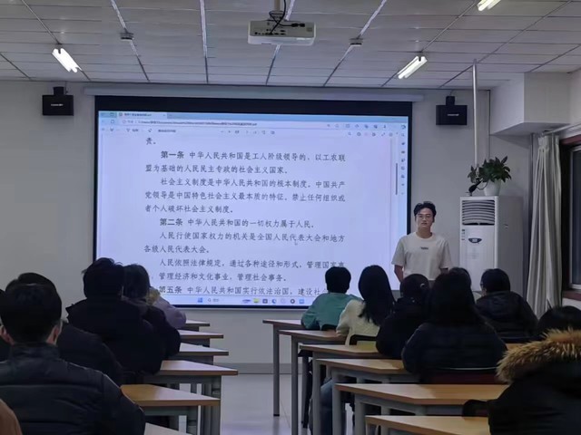 12月4日,宪法日当天,组织全体教师学习习近平法治思想,完成宪法知识答题。以班级、宿舍为单位,组织观看宪法直播,跟读宪法条例,跟唱《宪法伴我们成长》,增强全体同学法治意识引导大学生积极参与法治社会建设12月5-6日,组织开展“弘扬宪法精神,建设法治中国”宪法学习与宣传活动。继续深入广泛开展“宪法晨读”以团支部书记领读、同学跟读的形式,学习宪法部分条款组织学唱、传唱宪法歌曲,让宪法精神深入人心;分组讨论和交流,分享对宪法的理解和感悟,使师生更深刻、更准确地认识宪法内容传承新时代法治精神。