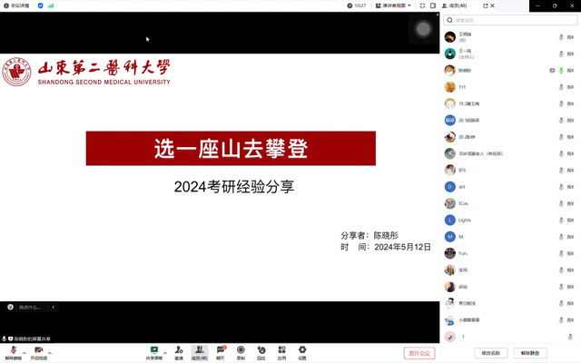 充分发挥朋辈榜样引领示范作用,帮助学生更好规划考研之路,促进优良学风建设近期,黄色网址大全 组织2019级考研成功优秀学子面向全体在校本科生及学生家长开展考研分享交流会系列活动5月12日,考研成绩优异的学生党员康玉梅、陈晓彤,通过线上腾讯会议的方式分享考研经验,各年级同学与家长积极参加。