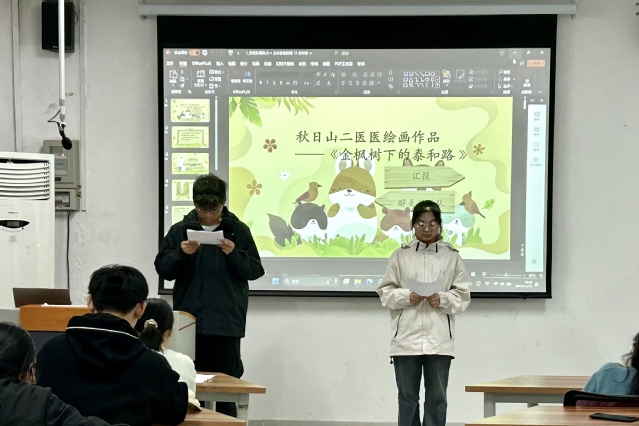 此次比赛分为初赛和决赛两个阶段,吸引了众多热爱绘画与诗词的同学参与。初赛阶段,同学们纷纷发挥自己的创意,描绘山二医校园秋景,经过激烈角逐,最终6支队伍脱颖而出。决赛现场,选手们通过PPT向评委展示参赛作品。作品多以手绘或电脑制图的形式进行创作。校园内金黄的树叶、静谧的小道等元素在画中生动展现,让观众身临其境,优美的诗词陈列,更为画作增添了浓浓国风,展现了作者对传统美的独到理解。展示完成后,学生代表组成的评委组从色彩运用、整体风格等几个方面对各个队伍进行评分,最终评出一等奖一名,二等奖两名,三等奖三名。