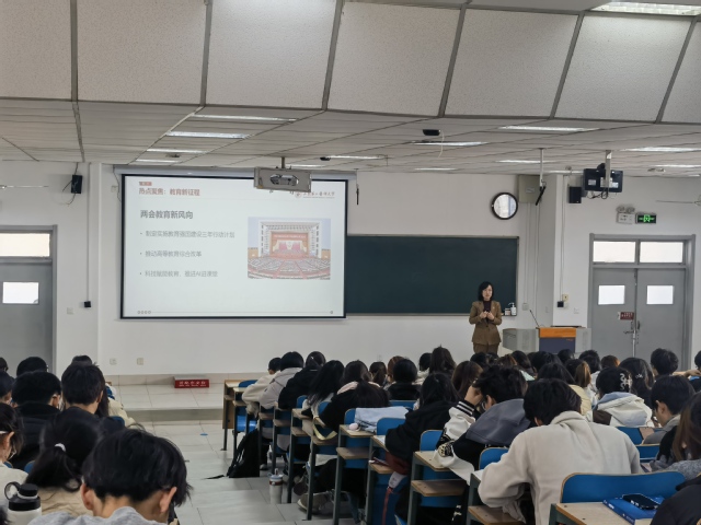 为深入学习贯彻习近平总书记关于学校思政课建设的重要指示精神,3月18日,黄色网址大全 党总支副书记、院长张蕊于A305教室,为学生讲述了一场以“教育领航,思政铸魂”为主题的思政课。2024级全体本科生及学工办辅导员参加。